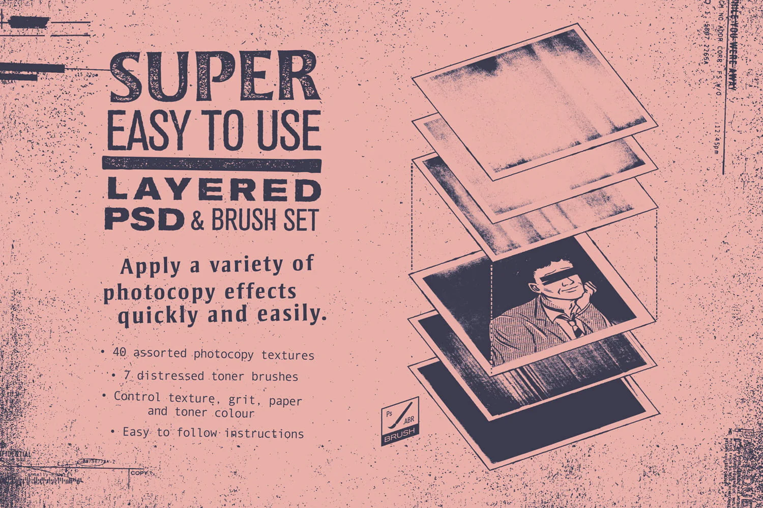 Just place your artwork in our Smart PSD template and choose from over 40 photocopy textures, paper, and toner color layers. Fine-tune with seven toner grit brushes, or add texture to your existing files with a library of 30 photocopy textures ready for use in Photoshop or Illustrator.